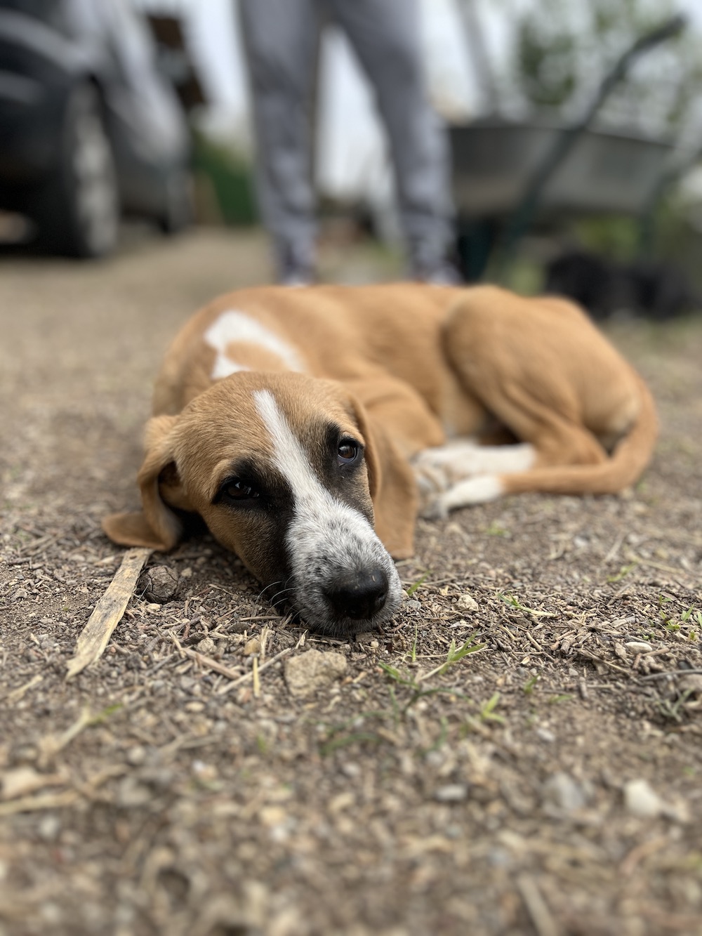Mein Wurf und ich wurden im Sommer entlang der Autobahn am Stadtrand von Skopje ausgesetzt – ganz allein und ohne Schutz. Ein tierlieber Mann, der regelmäßig Tiere rettet, fand uns, nahm uns bei sich auf und päppelte uns liebevoll auf.